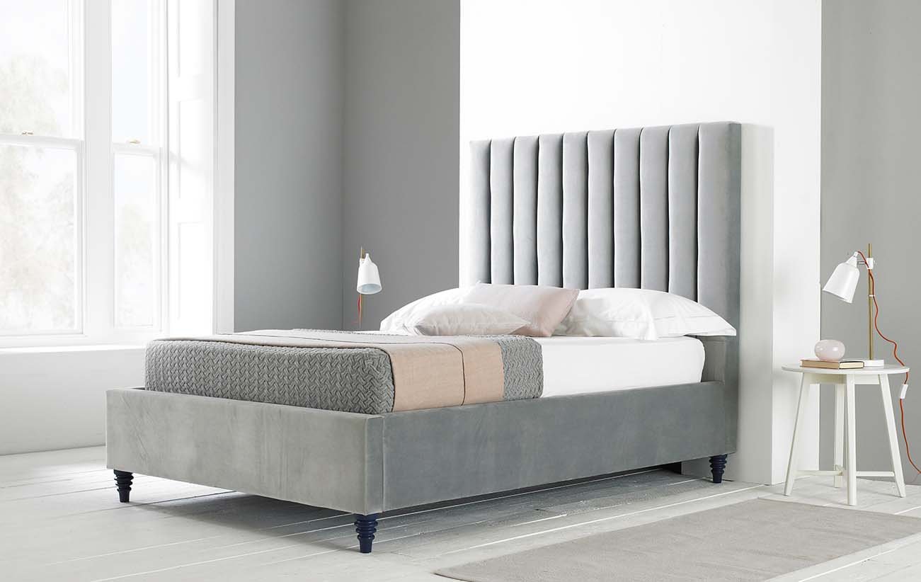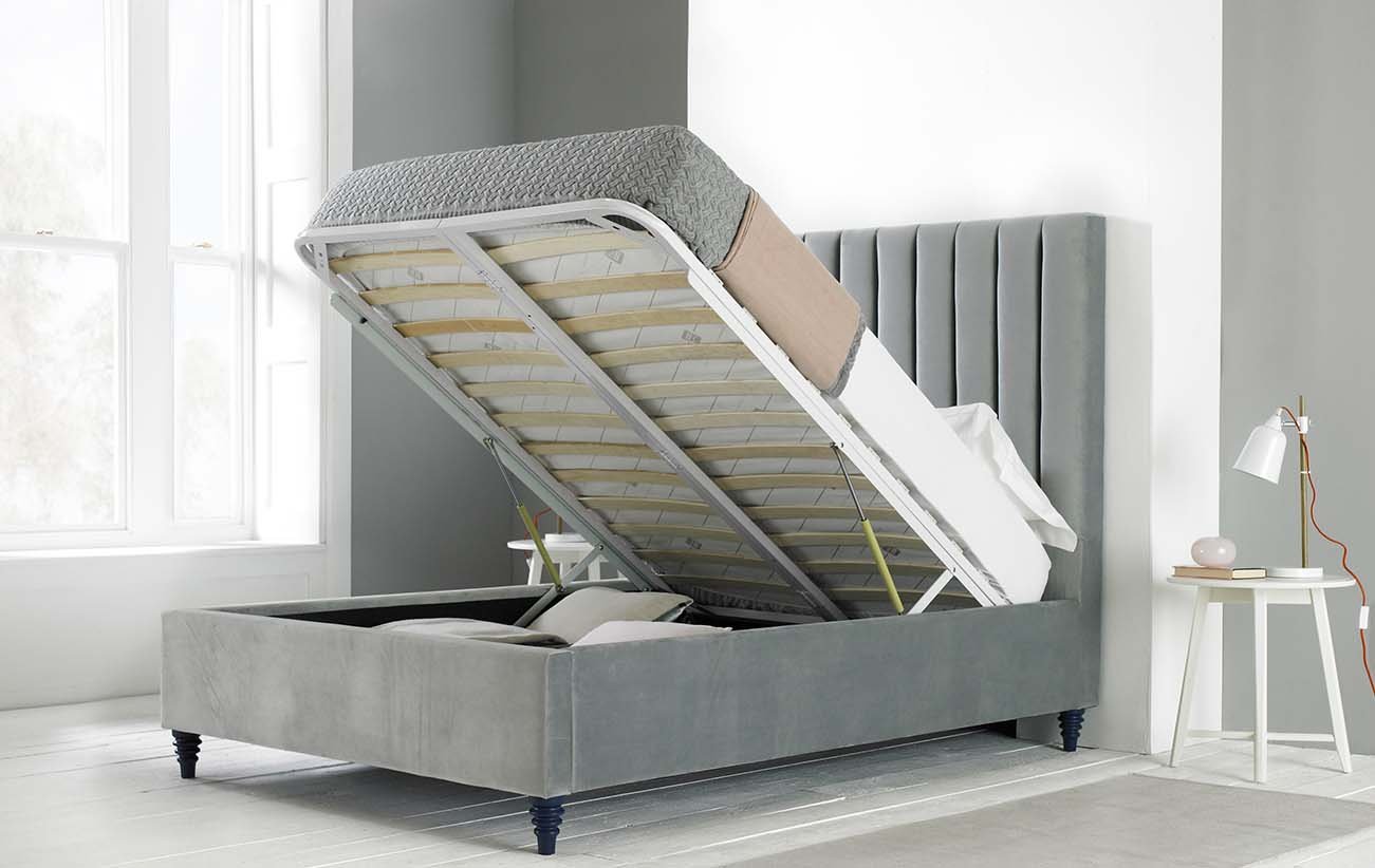 Upholstered in a plush velvet fabric, the Bern Ottoman bed frame features a foam-padded headboard, complete with a tubed design and painted, solid wood turned feet This self-assembly bed frame features a sprung slatted base for additional comfort and is crafted with a sturdy wood and metal frame With its heavy-duty hydraulic gas struts, this bed is designed to work with heavier mattresses and features a spacious storage area beneath, complete with a sturdy wooden base. To make assembly easier this bed comes with