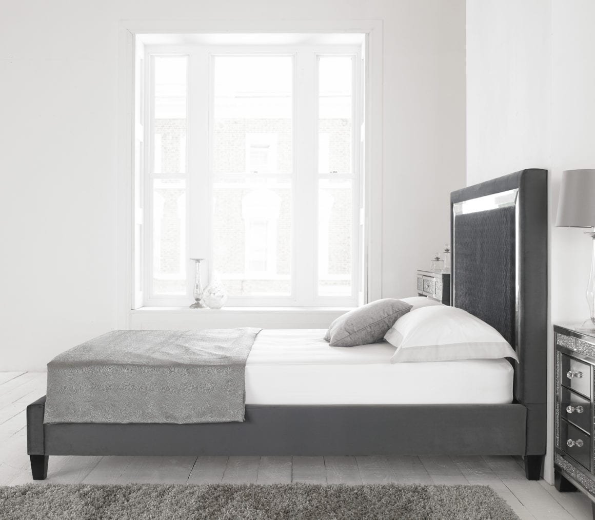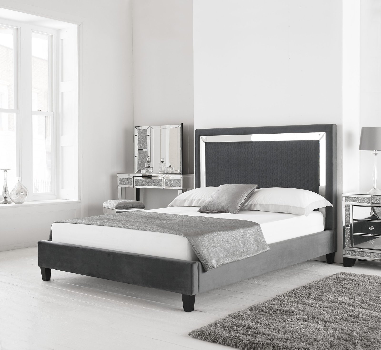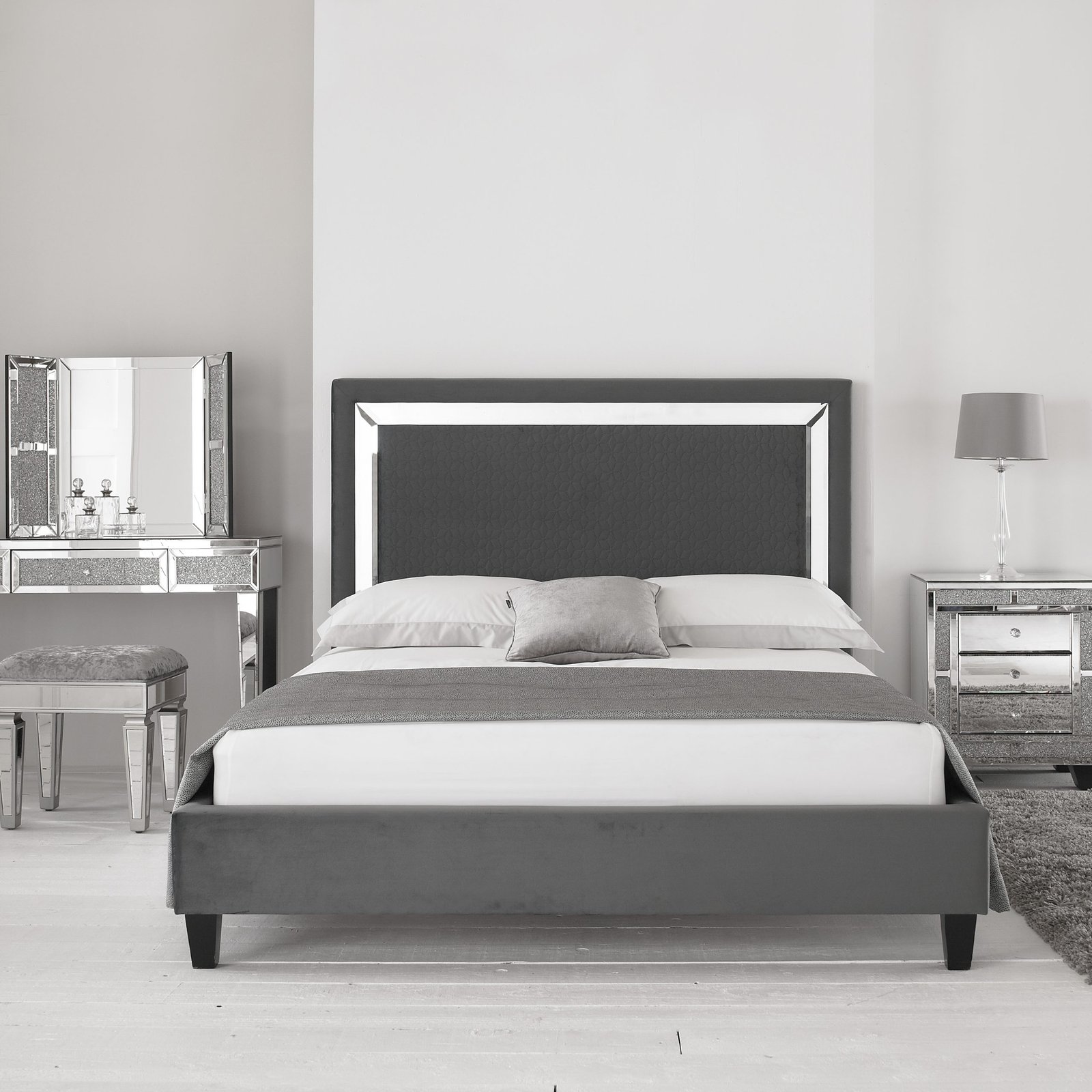 Plush Upholstered Bed frame with Mirrored Details on the Headboard, Wooden Feet, Sprung Slat Base, Metal Internal Frame.