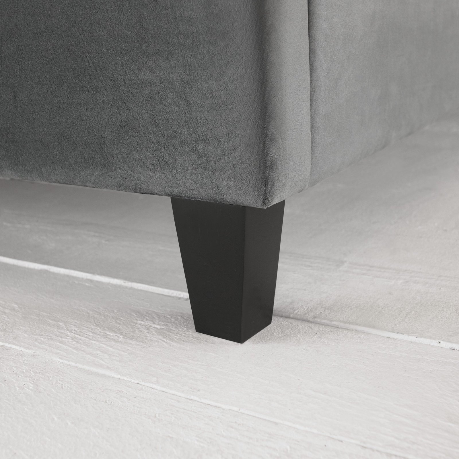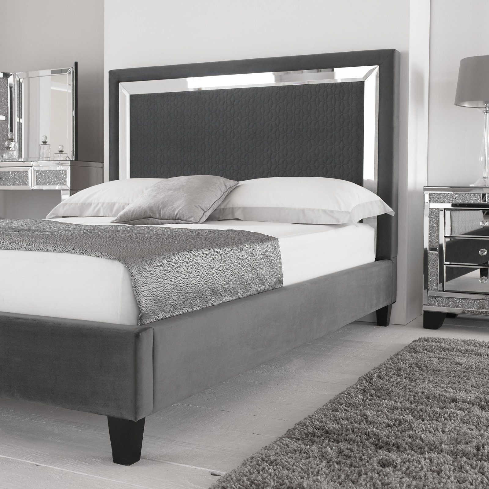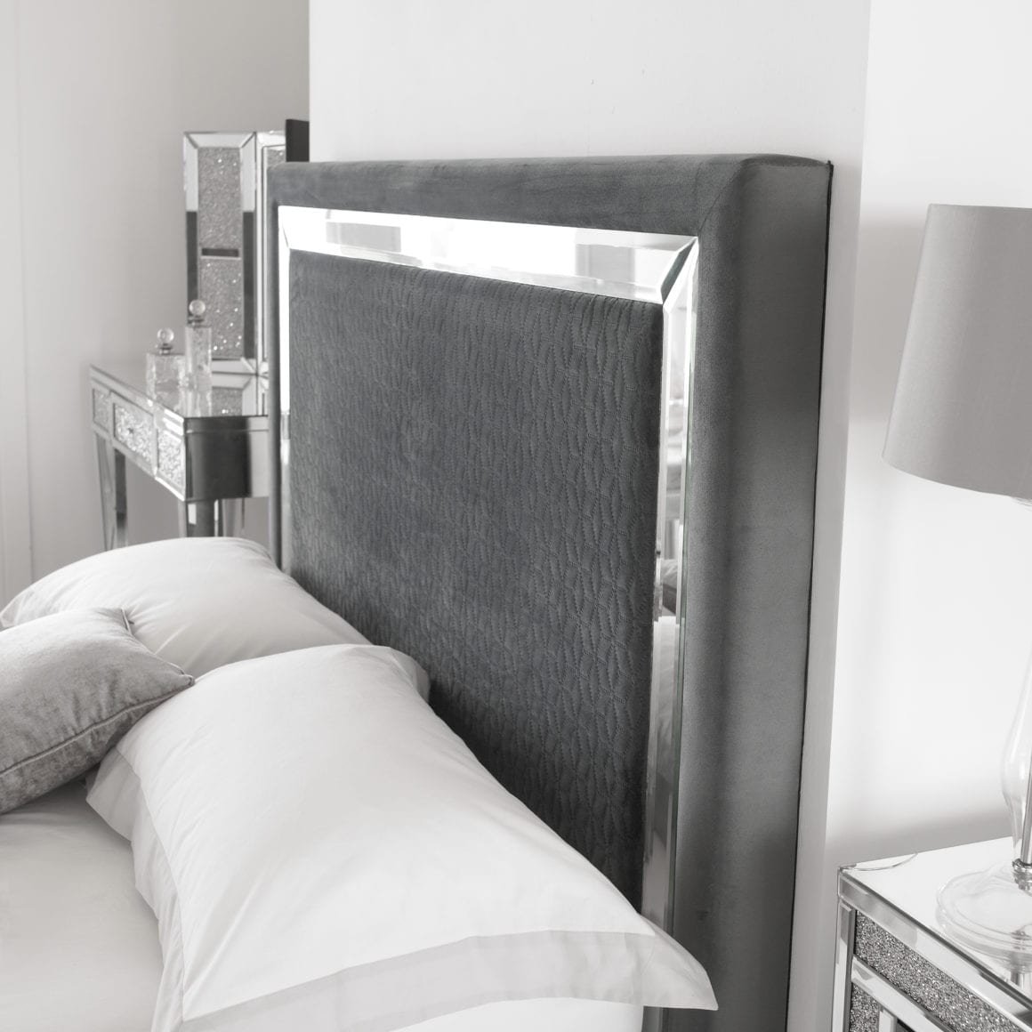 Plush Upholstered Bed frame with Mirrored Details on the Headboard, Wooden Feet, Sprung Slat Base, Metal Internal Frame.